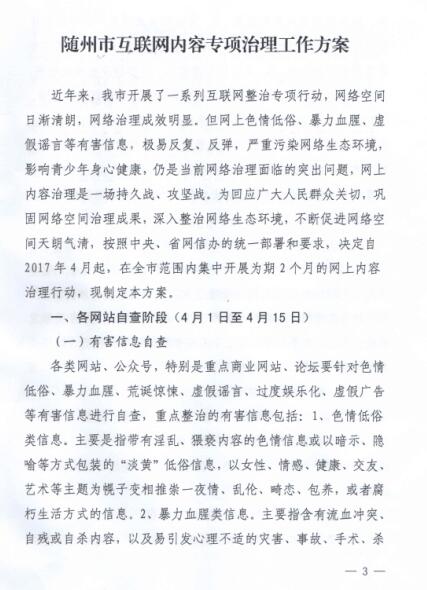 昨日下午,隨州清華網(wǎng)絡參加了由市委組織部組織的隨州市互聯(lián)網(wǎng)內(nèi)容專項治理工作會,會議主要對互聯(lián)網(wǎng)內(nèi)容整治工作方案進行了交流,以下為會議文件